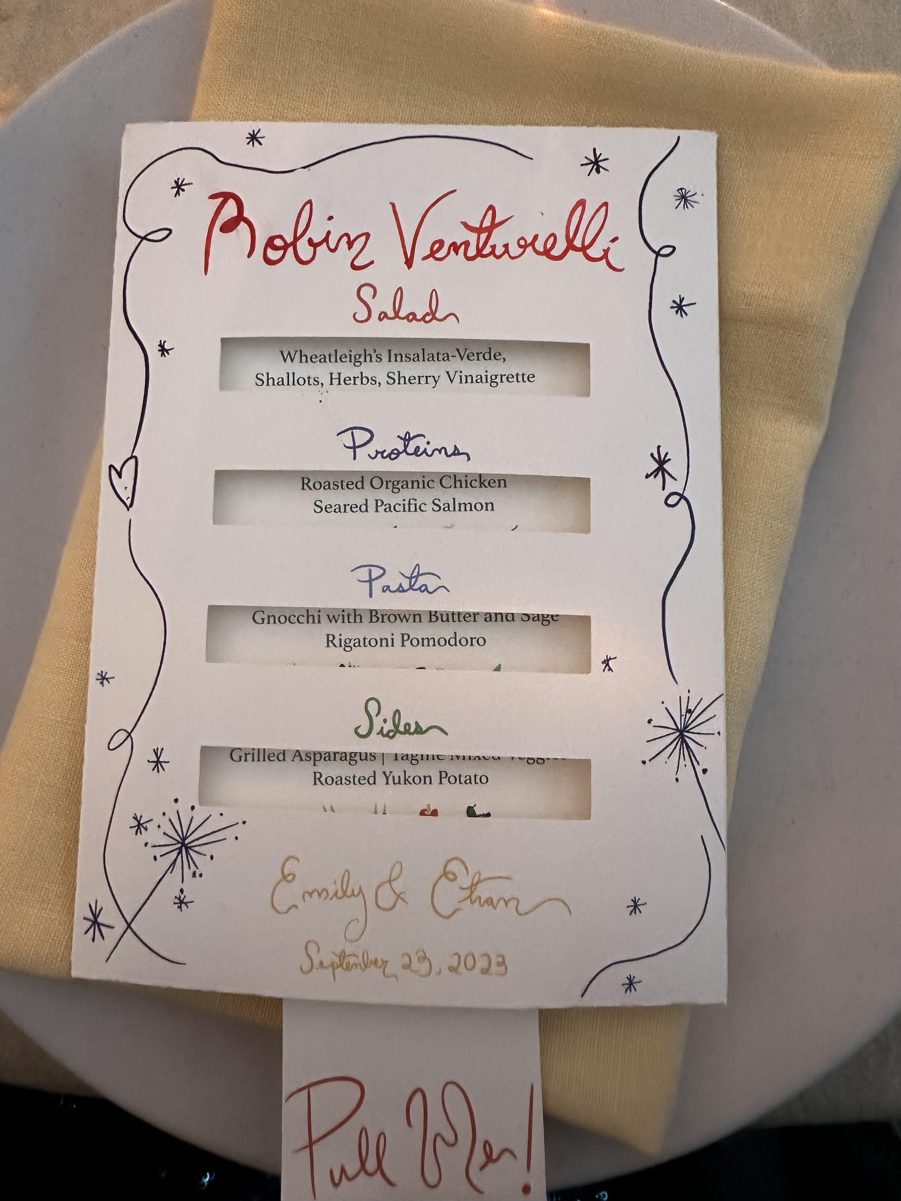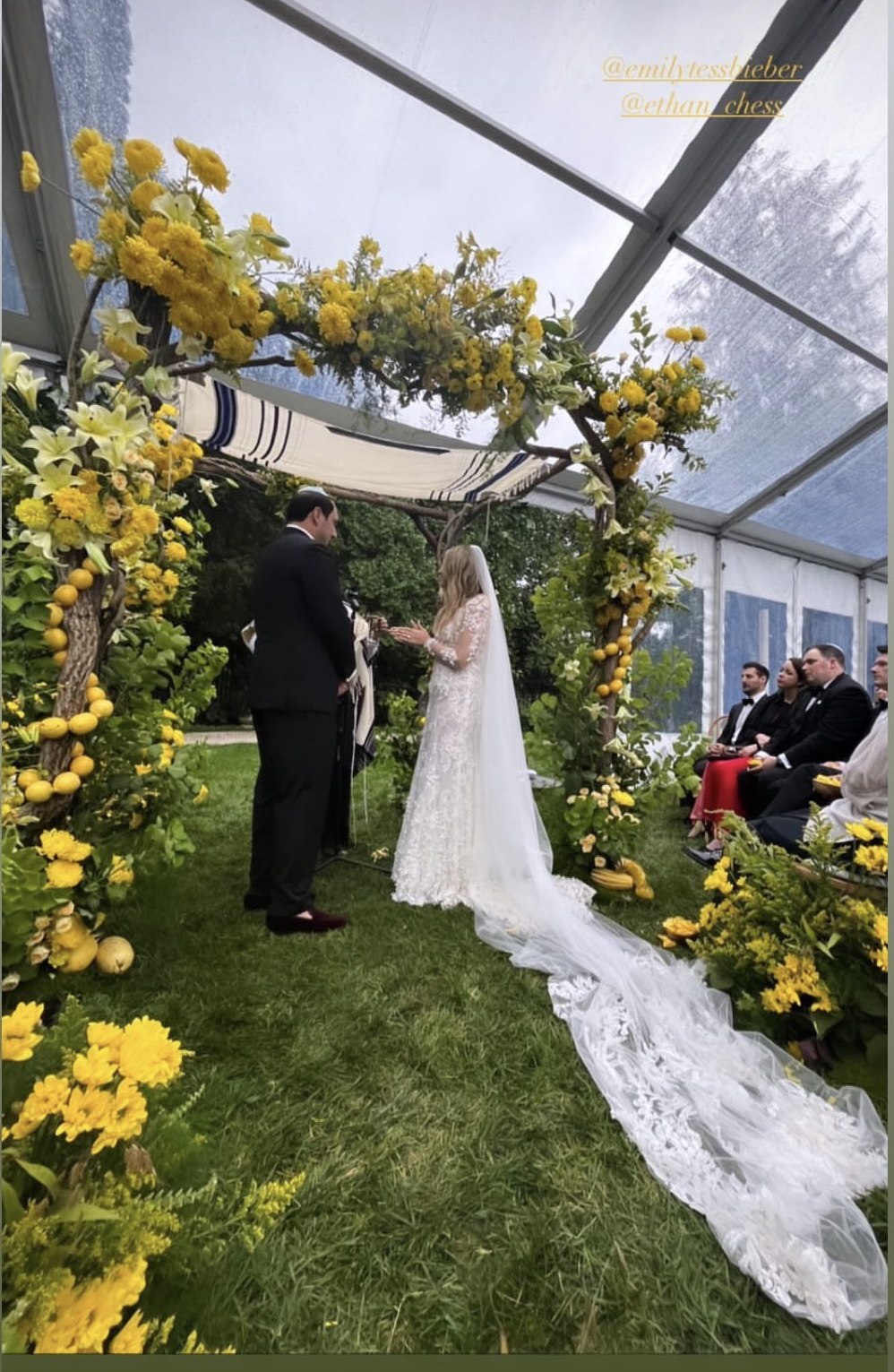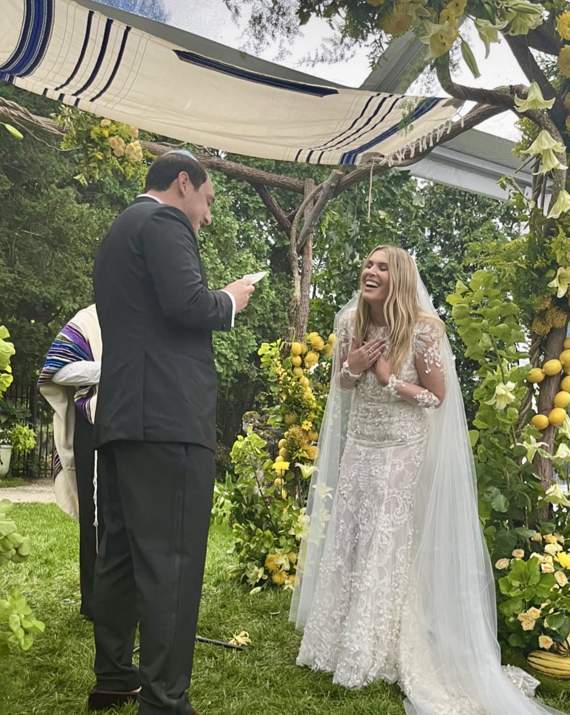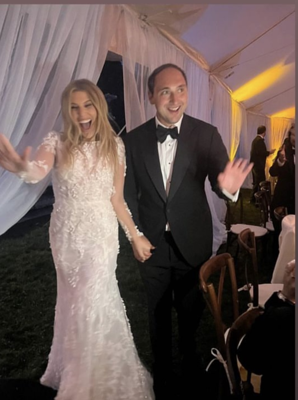 The black-tie wedding ceremony took place outdoors under a canopy in the rain. The reception was in a luxury tent with access to the gorgeous Wheatleigh lobby and grand staircase. Decorations included hanging apple baskets made with flowers, a martini luge, and sliding menu cards at each place setting. The toasts were superb! What an evening!